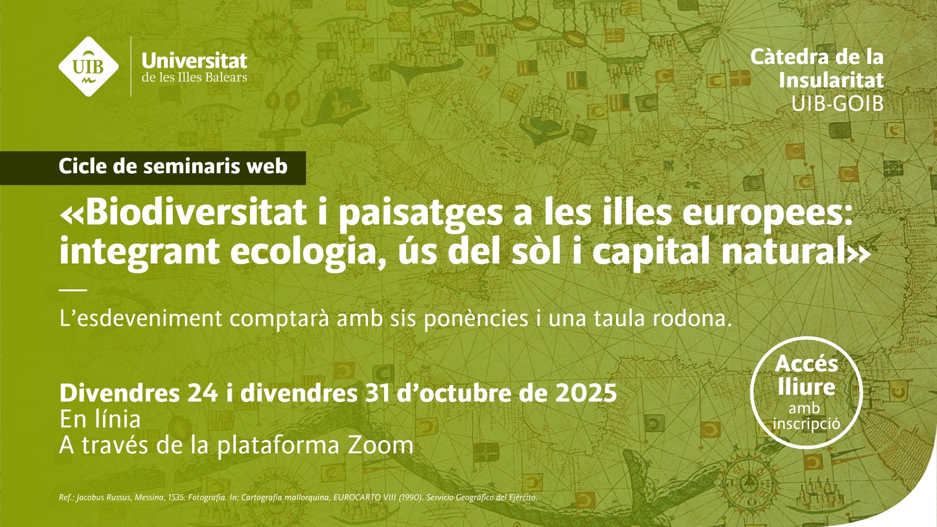 La sèrie de seminaris web reuneix destacats experts d’arreu d’Europa per explorar els principals reptes ecològics, socials i de governança que afecten els entorns insulars. A través d’un conjunt de conferències magistrals i una taula rodona final, l’esdeveniment abordarà qüestions clau com la biodiversitat vegetal a les illes mediterrànies, l’avaluació del capital natural, la percepció dels actors locals sobre la interrelació entre biodiversitat, clima i ús del sòl, així com els avenços recents en el coneixement de la biodiversitat a les Illes Balears.
